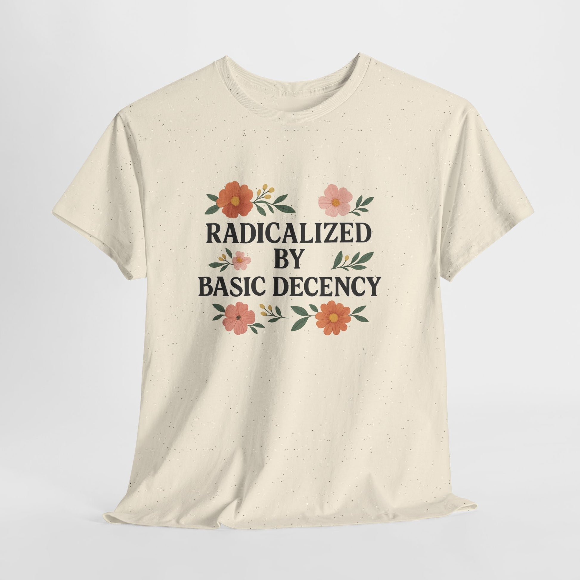 Make a bold statement rooted in kindness with our Radicalized by Basic Decency tee. Crafted from premium heavy cotton, this shirt blends comfort and durability while carrying a message that’s as powerful as it is simple. Featuring clean typography framed with delicate floral accents, it’s a perfect mix of soft style and unapologetic truth.